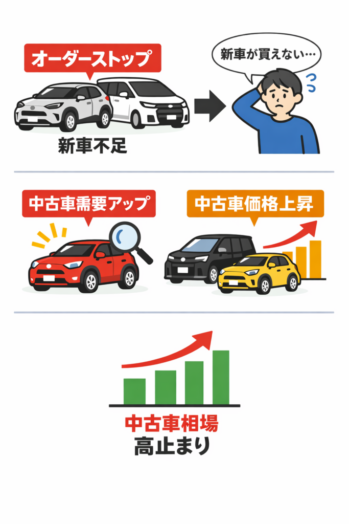 このような事態ですので、新車を購入しようとしていた方が中古車を選んでいます。